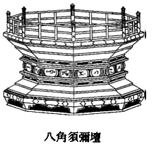至于八角的须弥坛,则如《金刚顶瑜伽中略出念诵经》卷一中说:“于其台上想波罗、?恕⒔5热?字,以为须弥山,其山众宝所成而有八角。”《广大仪轨》卷上中也说:“次于其海中,一缘而观想,八峰弥卢山,定慧内相合,结成弥卢山。”