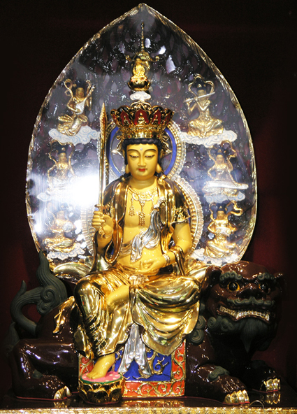 (菩萨)Mañjuśr&imacron;,文殊师利之略,旧称文殊师利,满殊尸利,新称曼殊室利。新旧有六译:无量寿经、涅��经曰妙德,无行经曰妙首,观察三昧经,大净法门经曰普首,阿目�揖�、普超经曰濡首,无量门微密经、金刚璎珞经曰敬首(已上旧译);大日经曰妙吉祥、文殊或曼殊,是妙之义;师利或室利,是头之义,德之义,吉祥之义也。此菩萨与普贤为一对,常侍释迦如来之左,而司智慧(普贤在右司理,但当以右智左理,今违之,一依胜劣之次第,二示理智融通之义也)。