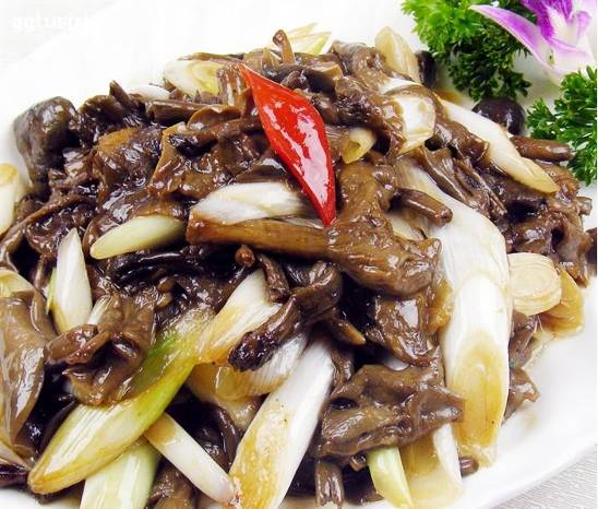 葱烧苔蘑是山西当地的一道特色菜,选用了山西特有的五台山台蘑,台蘑因无污染、高营养而著称。该菜品用上等的葱白与台蘑高汤勾芡,烧至入味。葱香味浓,苔蘑鲜香适口。