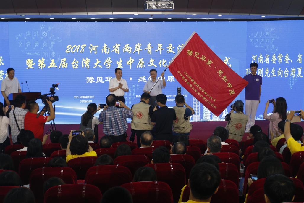 孙守刚在活动启动仪式上宣布:“2018河南省两岸青年交流月暨第五届台湾大学生中原文化之旅”正式启动,并向台湾夏令营领队授营旗,李勇向河南夏令营领队授营旗。