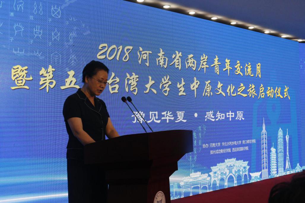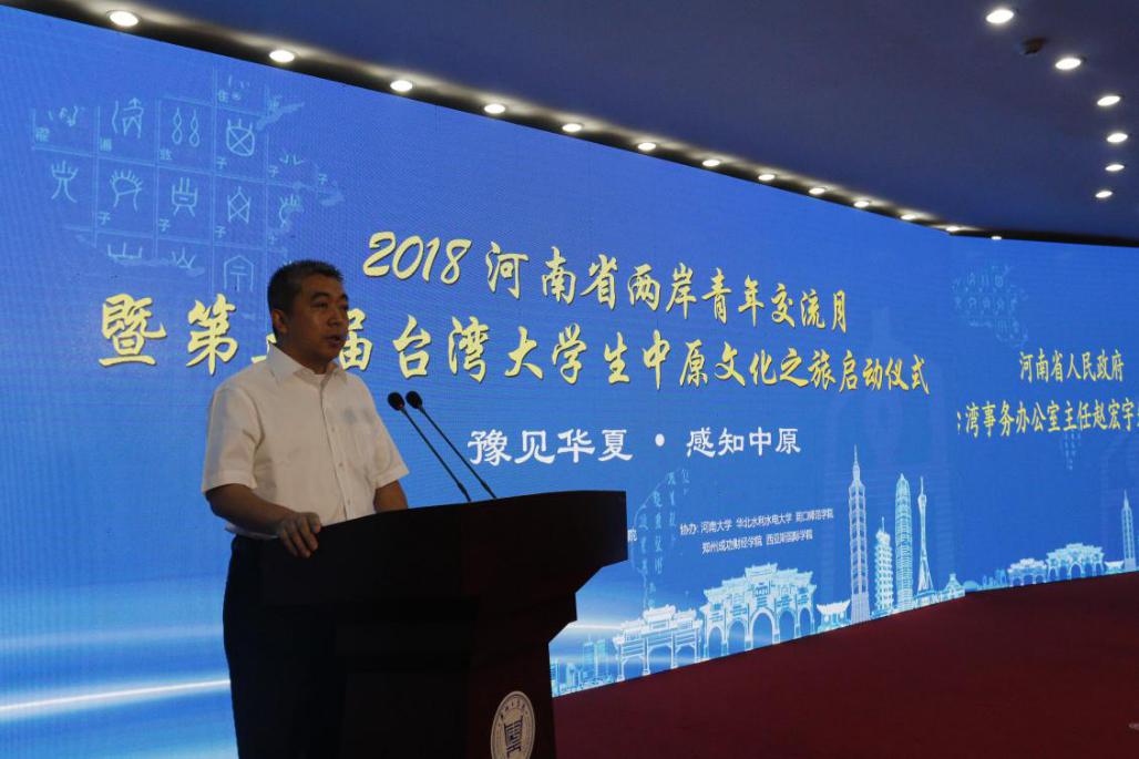 赵宏宇在致辞中首先向从台湾远道而来的师生表示热烈的欢迎,他引用梁启超、孙中山、毛泽东、习近平总书记等先贤和伟人的寄语和嘱托鼓励两岸青年学子为中华民族崛起而奋斗。他表示通过中原文化之旅活动的开展,必将促进两岸青年进一步增进沟通和了解,推动两岸关系和平发展,共圆中国梦,并预祝各位同学在交流月活动中能够游有所乐,学有所获,思有所悟。