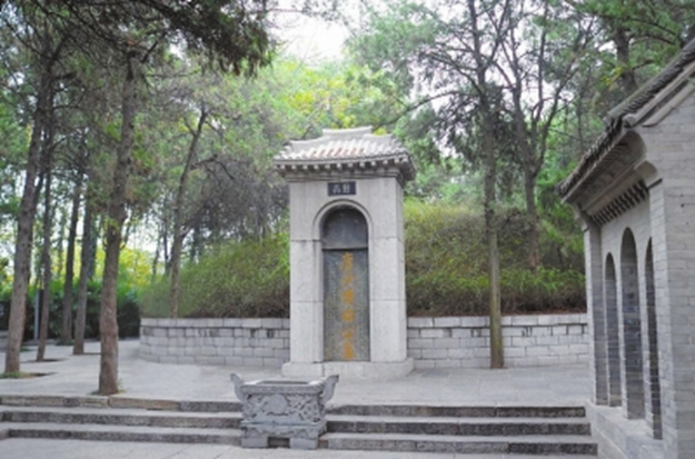 出乐天堂再上数十米台阶,琵琶峰顶的翠柏丛中,便是白居易的长眠之地。圆形墓顶之上,生长着萋萋芳草,墓围松林环绕,庄严清丽。墓前,高大的石碑上,刻着“唐少傅白公墓”。登高望墓,形似琵琶,墓地所在之丘为“琴箱”,其东南是长长的冬青墓道,为琵琶的“曲颈”。白居易75岁而终,死后没有葬在家乡,而是葬在了洛阳香山的琵琶峰上,应了他“香山居士”的号,琵琶峰又与他曾作的《琵琶行》相合。墓志铭是河南老乡、晚唐著名诗人李商隐,受白居易家人所托而写。