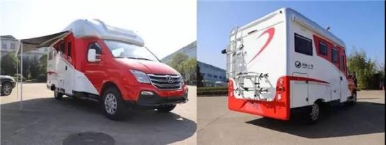 整车外形配合公司五十周年大庆采用的大面积红色喷漆,给人一种亮而不俗的感官享受,第一眼就能吸引众多路人眼球。据悉此台样车长度在6米之内,可容纳3-6人出行,满足了大部分C照驾驶员拥有房车的幻想。从车头延伸出去的红色拉花线条流畅,使得整车外观统一且年轻化。整车的外观采用现在房车较为流行的小额头设计,小额头尺寸小巧,前侧突出也很短,为驾驶舱上方视野也留出了更多空间,流线型的额头造型减小了风阻,使得驾驶起来更加舒适。车体外部配备了遮阳棚和便携式外置厨房。整车的外壳采用的是同欧洲房车同步的三明治车身压层工艺,采用房车最新的压板技术,车厢两边玻璃钢中层采用高等级的泡沫板填充,具有保温隔热、隔音降噪的性能,玻璃钢一体车型无缝衔接高效防水,车身框架结实耐用,安全又可靠,无论什么天气环境都能在房车中舒服地睡上一觉。