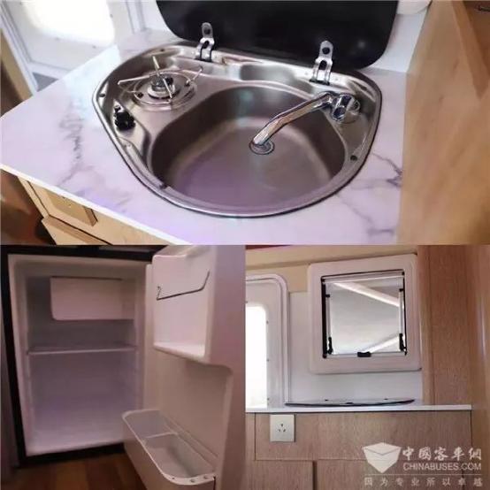 在休闲区的旁边就是一个小巧精致的厨房,安装了镶入式电磁炉和洗菜池,方便做一些简餐,或是洗洗水果、烧烧热水,下至的储物柜里可以摆放一些调味品、餐具等,容量大的冰箱镶嵌在车尾部的双人床下,不占空间。