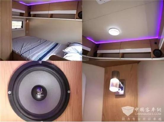 车的尾部有一张双人床,可容纳两个人睡觉;床头的两边安装了小夜灯,夜晚无论是夜读还是起夜都超级贴心,头顶的氛围灯给房车增添了一些温馨的小气氛;一整排的超大空间储物柜,可收纳日常生活出行用品等,不用再为东西不知道放哪而烦恼。