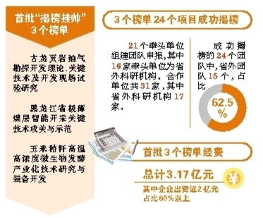 “把需要的关键核心技术项目张出榜来,英雄不论出处,谁有本事谁就揭榜”。按照省委省政府有关部署,省科技厅联合有关应用方,面向全国发布了2021年首批“揭榜挂帅”科技攻关项目榜单,经过申报、会议核验,依据最终应用方意见,首批发布的3个榜单25个项目中,拟有24个项目成功揭榜,1个项目因申报团队及方案均不满足应用方需要,没有成功揭榜。在3个榜单中,“古龙页岩油气勘探开发理论、关键技术及开发现场试验研究”榜单有15个团队成功揭榜,其中省内团队3个,省外团队12个。“黑龙江省极薄煤层智能开采关键技术攻关与示范”榜单有4个团队成功揭榜,全部为省内团队。“玉米秸秆高温高浓度微生物发酵产业化技术研究与装备开发”榜单有5个团队成功揭榜,其中省内团队2个,省外团队3个。