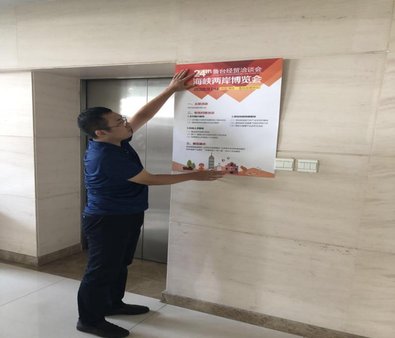 第24届鲁台经贸洽谈会将于2018年9月1日至4日如期举行。本届鲁台会以新时代、新动能、新发展为主题,将举行两岸高质量发展论坛、持续培育海峡两岸博览会品牌、专项对接洽谈以及重点项目签约等一系列活动。潍坊市高新区国际合作办积极开展鲁台会前期宣传工作,努力营造浓厚的活动氛围。与各园区、街办(社区)主动对接,在重点公共场所的显著位置张贴鲁台会宣传海报,并发动区内企业积极参会对接洽谈、开展商务合作。 同时,与高新区政务服务中心、潍坊光电产业园、潍坊生物医药产业园、潍坊蓝色智谷等驻区单位对接合作,推动其在各驻区科技企业孵化器LED大屏幕上滚动播放鲁台会电子宣传片,让区内更多企业、民众了解鲁台会、走近鲁台会,激发全民参与热情,积极营造浓厚的节会氛围。