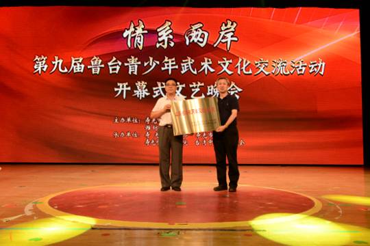 在7月8日的第九届鲁台青少年武术文化交流活动开幕式上,山东省台办副主任曹晓武代表省台办授予了寿光华夏国术院“山东省海峡两岸交流示范点”牌匾,寿光华夏国术院院长王金城领取了牌匾。