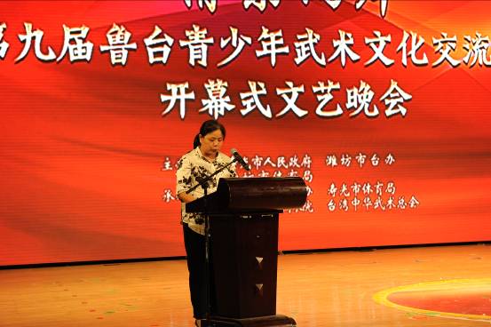 潍坊市台办主任刘金凤致辞。刘金凤表示,鲁台青少年武术交流活动已成功举办了九届,搭建起两岸青少年交流合作的连心桥。希望两岸各界借助武术交流这一平台,传承民族文化,弘扬民族精神,增进两岸同胞的文化认同和民族认同,促进中华民族伟大复兴的“中国梦”早日实现。