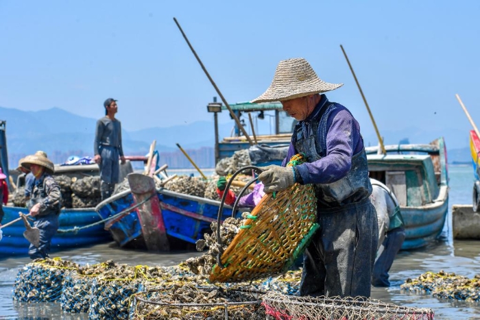 福建省罗源县松山镇北山村养殖户在收获海蛎(资料图片)。新华社发
