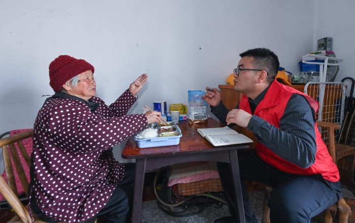 3月28日,在杭州市临安区昌化镇联盟村,网格党员栗雪锋(右)为90岁的独居老人帅美珠送餐,并了解她当前的困难和需求。新华社记者 徐昱 摄